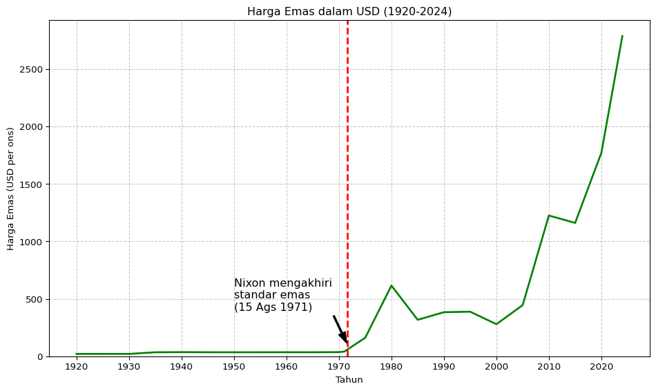 - Efeknya adalah kenaikan dramatis harga emas, yang naik dari $35 per ons menjadi puncaknya $2785 pada akhir tahun 2024, kenaikan sekitar 7857%. (Lihat Gambar A.1).